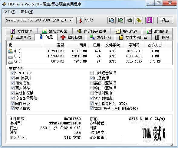 (2)信息:“信息”项是查看硬盘的基本信息包括支持的特性、固件版本、硬盘容量、扇区大小等基本信息。