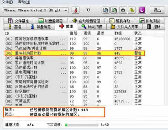 5、最后,我们点击出现了警告的硬盘参数,可以看到硬盘出现了坏道的损坏扇区已经被自动修复。
