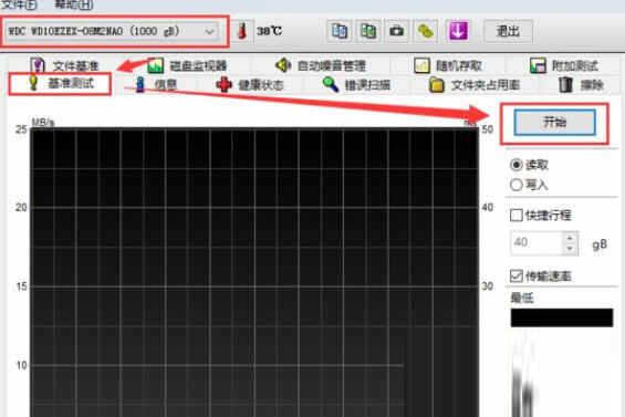 启动硬盘检测软件,先选择我们的电脑的硬盘,再选择基准测试,点击右侧的开始后,耐心等待一会时间。