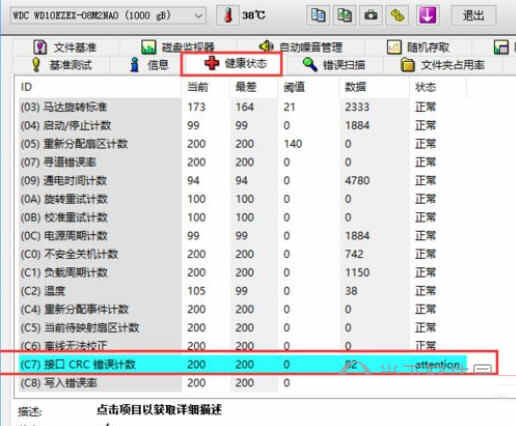 然后我们在顶部可以选择健康状态选项,可以看到硬盘的所有检测项。