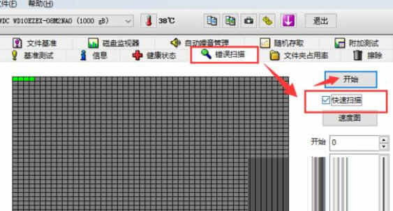 如果想知道硬盘有没有坏道,可以在顶部点击【错误扫描】,在右侧勾选【快速扫描】,然后点击开始。