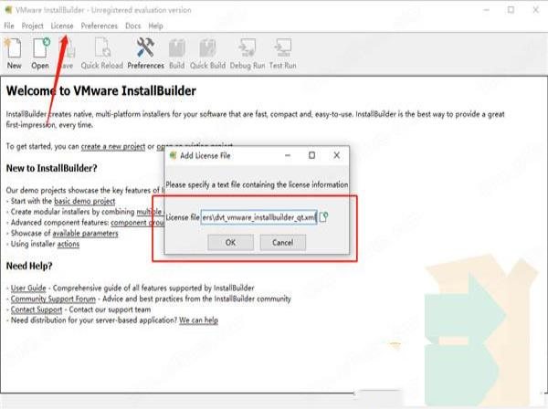8、运行软件后,找到License选择Register license,然后将安装包内的dvt_vmware_installbuilder.xml导入即可实现授权