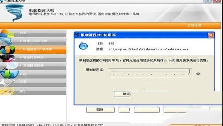 控制进程CPU使用率,防止个别进程CPU使用太高而拖慢电脑整体速度、让电脑变卡。防止变慢,即等于变像的等于给电脑加速。
