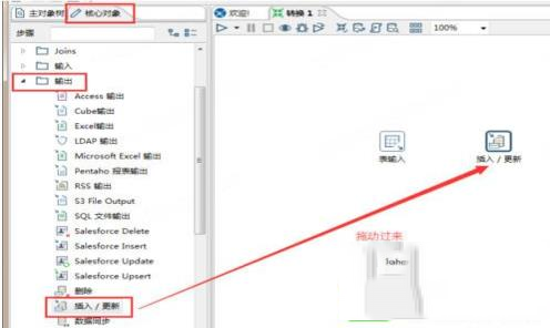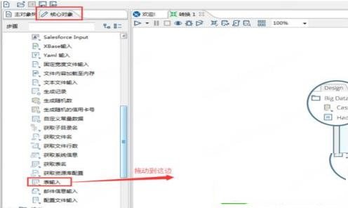 在左边的面板中选择“核心对象”,在核心对象里面选择“输入->表输入”,用鼠标拖动到右边面板。
