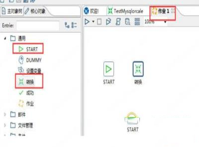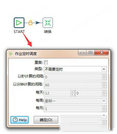 使用作业可以定时或周期性的执行转换,新建一个作业。并从左边面板拖入start 和转换。