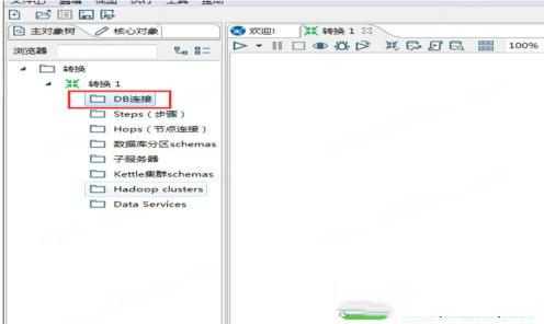 在连接数据库之前,首先需要保证当前在一个transform(转换)页面,然后点击左侧选项栏中的“主对象树”,然后右键点击“DB连接”,选择“新建”。