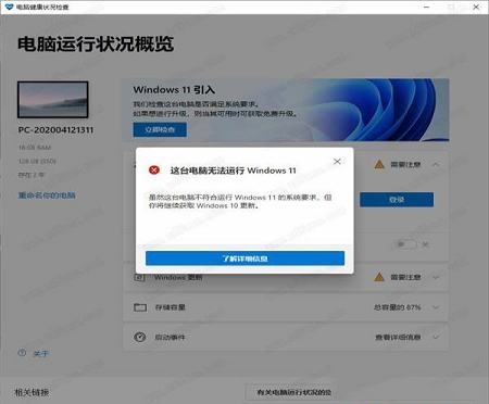 2、当系统不符合时会出现以下页面,若符合则可以点击更新,免费升级为win11。