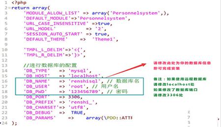 3、用网页编辑器或相关软件打开主程序根目录下的配置数据库配置文件:目录位于Application\Common\Conf\ 下 的文件config.php 修改数据库配置文件:即可完成安装。