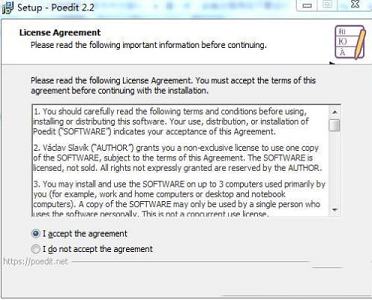 1、下载软件包解压,运行“Poedit-2.2-setup.exe”程序安装软件,选择I accept接受协议。