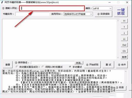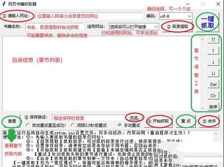 4、一键抓取:也称为°傻瓜模式"”,意思是网页书籍抓取器可以实现全自动抓取及合并功能,直接输出最终的文本文件。前面可能需要输入最基本的网址、保存位等信息(会有明显的操作提示),一键抓取也可以调整完章节后使用,将自动完成抓取及合并操作。