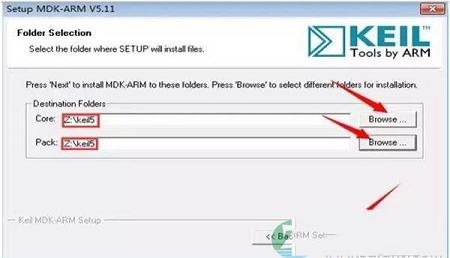 4、分别点击Core与Pack后面的Browse更改安装路径,建议安装在除C盘以外的其它磁盘,可以在D盘或者其它盘创建一个keil5文件夹,然后点击Next。