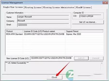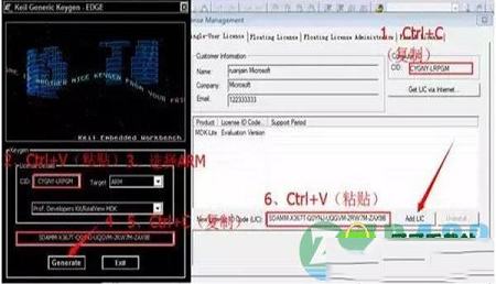 4、复制CID中的内容,将其粘贴到到2处的CID中,然后选择Target选项框中ARM选项,再点击Generate,然后复制5处的内容,将其粘贴到6处的New license中然后点击Add LIC。