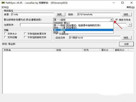 PathSync(文件同步工具) 是由Cockos的一个伟大的员工在04年开发的,本来是随便玩玩的,结果是无心插柳柳成荫,反而将Pathsync做成了一个体积小巧,功能强大的同步工具。从04年到现在,已经陆续推出了7个版本,最后一次更新是在07年1月9日。目前的功能已经趋于完美,所以很久没有新动向了,如果大家有什么特殊想法,请遵循GPL协议,自己修改源代码增加修改功能。由于英文与中文的差异性语法的差异,我在汉化时修改了部分源代码(例如英文对单复数的表示,并未修改其他功能代码),由于本人资质浅薄,部分词语的中文表达感觉不是很到位,所以还请大家指出不吝指出。