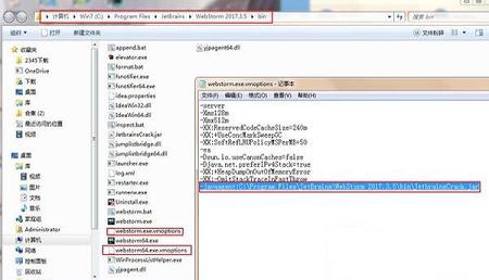 9、再同一目录下用记事本分别打开webstorm.exe.vmoptions和webstorm64.exe.vmoptions并添加代码:-javaagent:C:\Program Files\JetBrains\WebStorm 2017.3.5\bin\JetbrainsCrack.jar然后保存