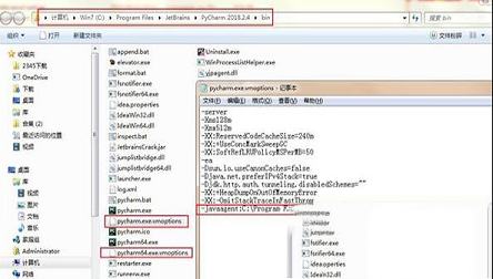 3、在打开的bin目录下用记事本分别打开pycharm.exe.vmoptions和pycharm64.exe.vmoptions并在后面添加代码:-javaagent:C:\Program Files\JetBrains\PyCharm 2018.2.4\bin\JetbrainsCrack.jar然后保存