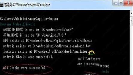 进入cmd命令行,输入appium-doctor,出现以下提示,AllChecksweresuccessful,说明环境成功,到此软件安装完成。