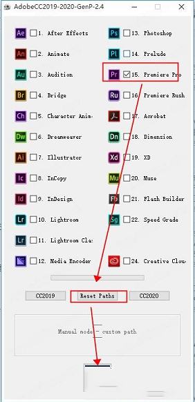 2. 打开 RunMe.exe 点击你需要破解的软件,如我要破解Adobe Premiere,然后点击下方第二个图标,就会自动查找你安装的软件,查找成功之后,点击第三个药丸图标,就可以自动完成破解。