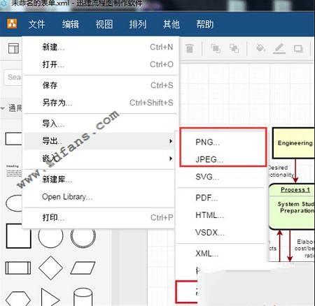 3.在打开已有流程图或是制作好流程图后,需要将流程图保存为图片文件,请选择“文件”-“导出”,然后根据需要选择png或jpeg格式进行保存;