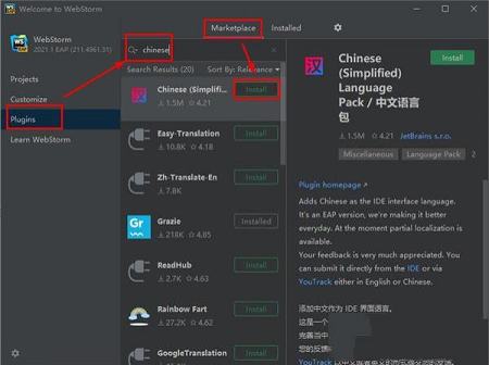 11、选择“marketplace”接着在输入框中输入“Chinese”后即可找到汉化插件,点击“install”进行下载;