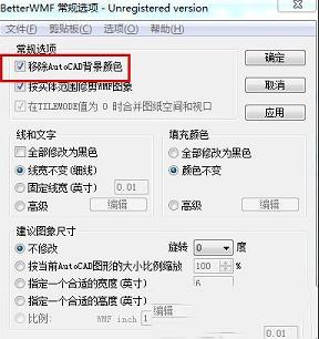 3、转到该应用程序界面,选中常规选项中的“移除AutoCAD背景颜色”和“按实体范围修剪WMF图像”;在线和文字中,选择全部修改为黑色,我一般使用固定线宽0.025英寸或默认。