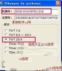 2、再打开软件包中的“TGkeygen.exe”文件,输入复制的id号或机器码,将其复制到天正2014注册窗口中