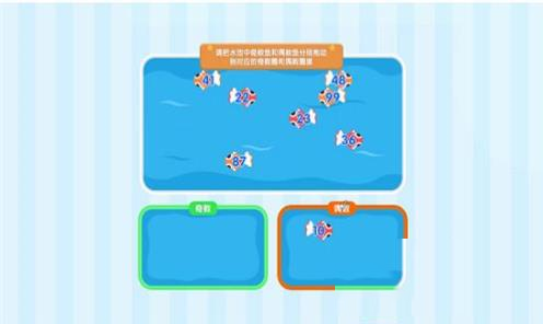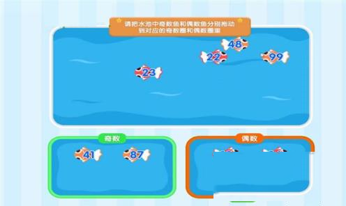 5、提供游戏编程练习,请把水池中奇数鱼和偶数鱼分别拖动到对应的奇数圈和偶数圈里