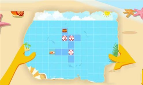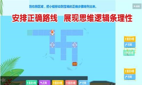 10、安排正确路线展现思维逻辑条理性,拖动方框到右侧区域,把小船移动到宝箱的正确步骤排列出来。