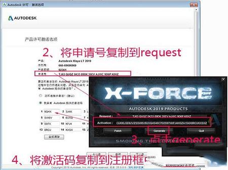 7、将申请号复制到注册机request框中并点击“generate按钮”生成激活码,再将注册机上生成的激活码复制到软件注册框点击激活即可