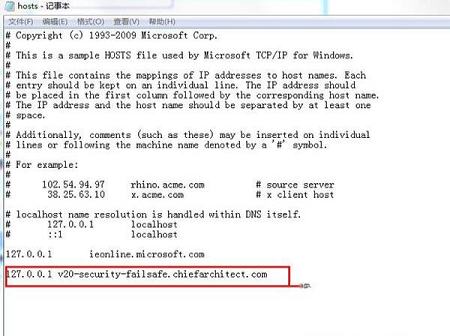 2、打开host文件,默认位置为C:\Windows\System32\drivers\etc,然后填入内容:127.0.0.1 v20-security-failsafe.chiefarchitect.com进行联网屏蔽。
