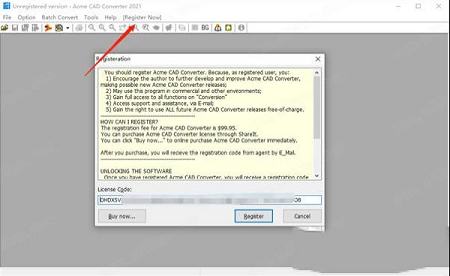 1、该软件为绿色版,解压缩双击“AcmeCADConverter.exe”运行,点击注册选项,然后将安装包内的注册码复制到软件中