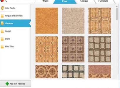 该房屋平面图绘制软件提供600多种材料和家具物品。在任何墙壁上双击,程序将打开“材质和颜色”窗口。在这里,您可以选择各种类型的墙纸,墙砖,镶木地板和层压板,地毯,油毡和天花板。尝试不同的颜色和纹理以获得最佳匹配。