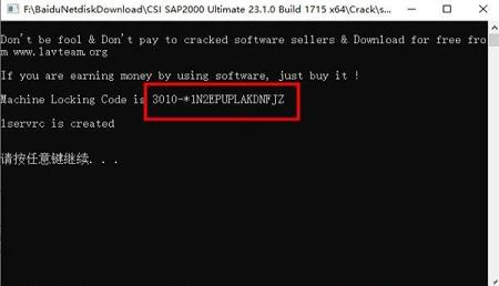 10、双击运行Crack文件夹中的sap2000_v23_kg.exe程序,按任意键继续,生成一个许可证文件(lservrc);