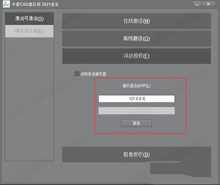 8.再选择“浮动授权”,不要勾选“启用备用服务器”,在服务器名称中输入:127.0.0.1,再点击“激活”