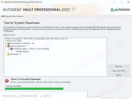 7、在安装时会弹出如下的“测试系统准备情况,诊断工具执行一系列检查以验证是否仍为软件框架正确配置了系统,查看以下测试的状态。 纠正任何警告或故障后,单击“重新测试”以重新运行诊断并验证系统配置”的窗口,用户等待测试完成,【re-test】为从新测试,测试成功则能够正常安装。
