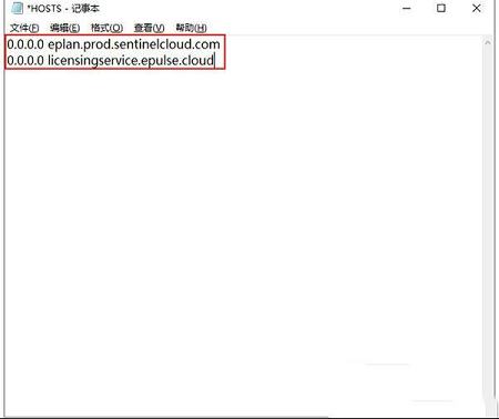 9、修改里面的内容为“0.0.0.0 eplan.prod.sentinelcloud.com” “0.0.0.0 licensingservice.epulse.cloud”,并保存退出,如下图: