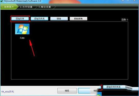 1、下载打开软件包,运行“Mytoolsoft Watermark Software.3.0.chs.th_sjy已注册版.exe”进入软件界面,点击添加文件或添加文件夹,导入需要添加水印的图片。