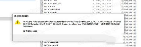 5、将MultiKey_18.1.1_x64_24032019_testmode文件夹复制到软件安装目录下,再运行MasterCAM_TEST_185221_hasp_dealer.reg添加注册表信息,点击是