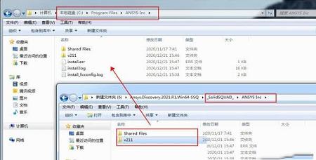 9、打开文件夹SolidSQUAD--ANSYS Inc,将里面的"Shared Files","v211"两个文件夹复制到软件根目录下。默认路径【C:\Program Files\ANSYS Inc】