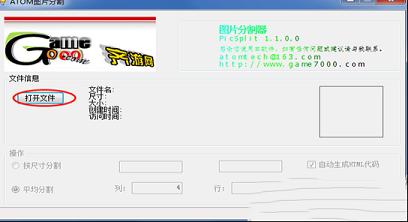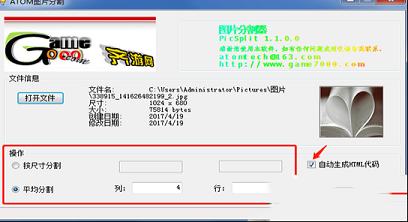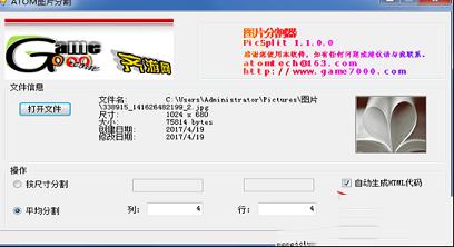 1、将一张大图片分割成若干小图片,支持BMP、JPEG、GIF、PNG、TIF文件。2、可以按照指定的大小或指定的数目对大图片进行分割。