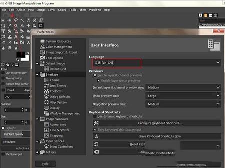 在软件里的“Edit->Perferences ”然后点击Interface,将右侧的Language改为汉语(ZH_CN)重启GIMP即可。