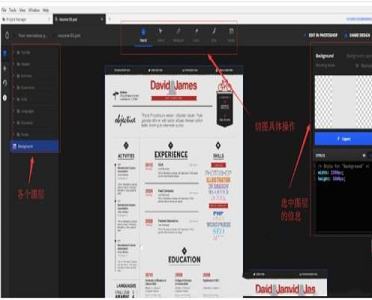 3、打开这个psd之后,可以看到很多工具栏。在界面中的左边,有四个按钮图层、活动信息、版本记录、psd的多种相关信息。上边的工具栏是对psd进行具体的切图工作。右边的工具栏显示的是具体选中或者进行操作的获得的图层信息。