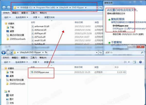 5、将DVDRipper.exe复制到安装目录中,点击替换目标中的文件,默认路径C:\Program Files (x86)\UkeySoft\DVD Ripper。