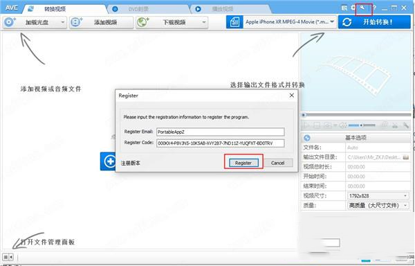 2、打开软件点击右上角的要是,然后会自动出来我们的激活码,点击register;