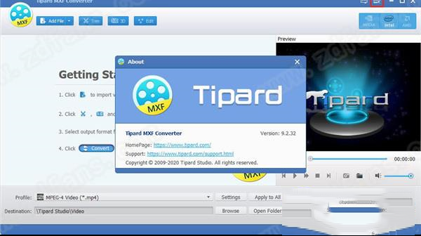 9、双击打开Tipard MXF Converter破解版软件,点击红色选框下的About,如下图软件破解完成,可以放心使用软件